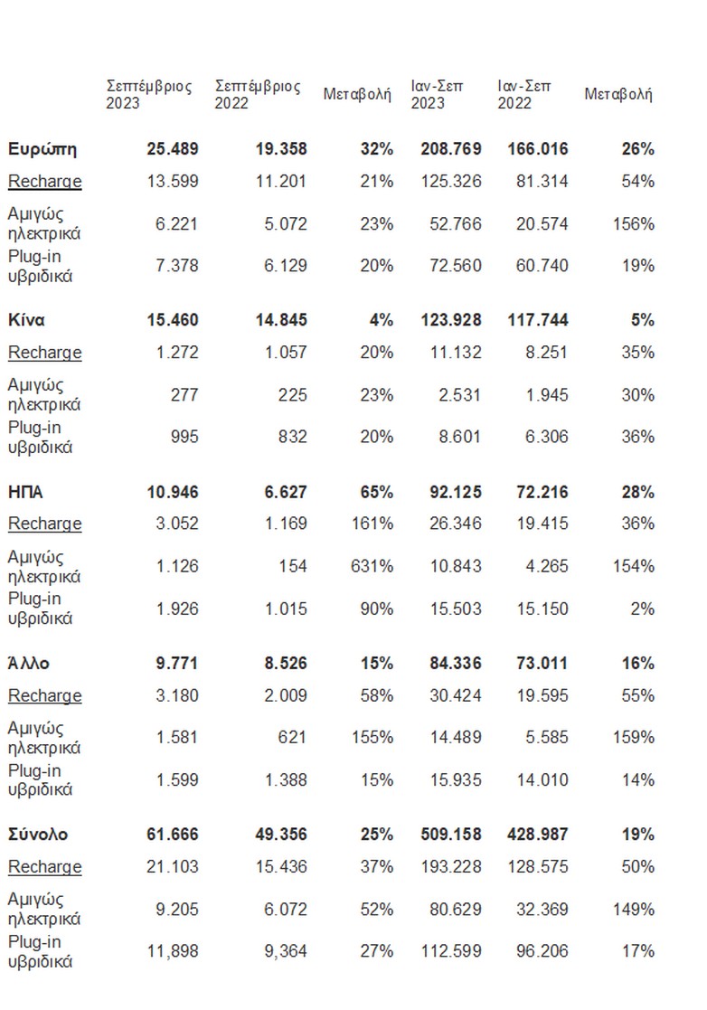 Οι πωλήσεις των μοντέλων σειράς Recharge της Volvo Cars, με αμιγώς ηλεκτρικό ή plug-in υβριδικό σύστημα κίνησης, ενισχύθηκαν κατά 37% σε σύγκριση με τον περσινό Σεπτέμβριο, αντιπροσωπεύοντας το 34% όλων των αυτοκινήτων Volvo που πωλήθηκαν παγκοσμίως. Το μερίδιο των αμιγώς ηλεκτρικών αυτοκινήτων επί των συνολικών πωλήσεων ήταν 15%, έναντι 12% τον Σεπτέμβριο του 2022.