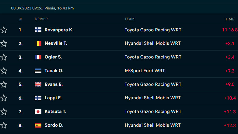 Οι χρόνοι και η κατάταξη της κατηγορίας Rally1 μέχρι και την 3η Ε.Δ. του ΕΚΟ Ράλλυ Ακρόπολις Πίσια: Πρώτος ο Neuville, ακολουθεί ο Rovanpera με μόλις 2 δευτ. διαφορά.