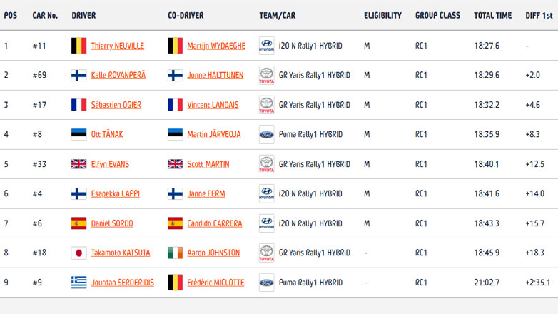 Δεύτερος ταχύτερος σε αυτή την Ε.Δ. ο Neuville της Hyundai ο οποίος με χρόνο +3.1 δευτ. από τον Φινλανδό παραμένει πρώτος στο φετινό ΕΚΟ Ράλλυ Ακρόπολις, αν και με μικρή πλέον διαφορά.
