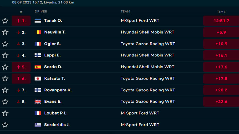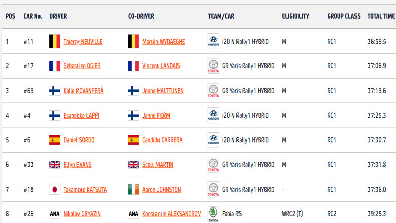 Οι χρόνοι της κατηγορίας Rally1 για την 5η Ε.Δ. του ΕΚΟ Ράλλυ Ακρόπολις Λιβαδειά είναι:
