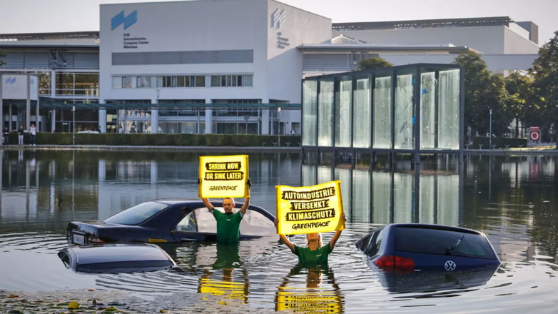 Για να τραβήξει τα βλέμματα και να ευαισθητοποιήσει, η Greenpeace βύθισε τρία αυτοκίνητα στη ρηχή λίμνη έξω από το εκθεσιακό κέντρο όπου πραγματοποιείται η έκθεση.