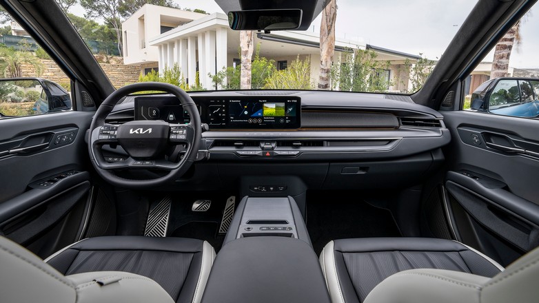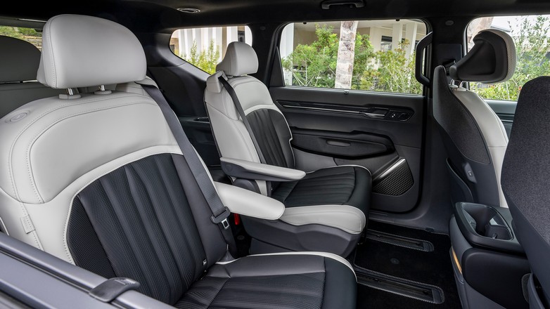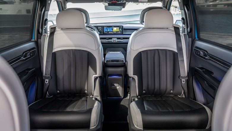 Τα καθίσματα χαλάρωσης προσφέρουν αναβαθμισμένη άνεση, ενώ τα περιστρεφόμενα μπορούν να «βλέπουν» προς την τρίτη σειρά. Επιπλέον, το EV9 διαθέτει καινοτομίες που κάνουν τα ταξίδια πιο άνετα και βολικά, όπως ψηφιακούς εξωτερικούς καθρέπτες, αυτόματες χειρολαβές πόρτας τύπου pop-up, αεριζόμενα καθίσματα πρώτης και δεύτερης σειράς και τριπλή πανοραμική οθόνη.