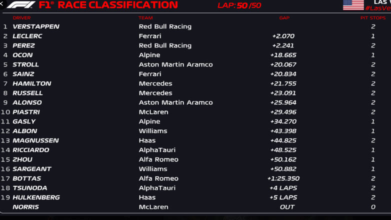 Για πολλούς γύρους οι Leclerc – Perez – Verstappen θα αλλάζουν εναλλάξ την πρωτιά κάνοντας χρήση DRS. Τελικά ο Ολλανδός θα πάρει μία ακόμη νίκη με τον Μονεγάσκο στη δεύτερη θέση να κερδίζει τις εντυπώσεις και το χειροκρότημα. Η τελική κατάταξη.