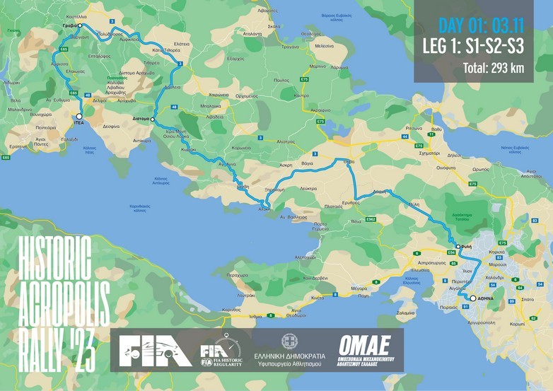 Την πρώτη αυτή ημέρα, και στο Α’ σκέλος της, τα πληρώματα θα περάσουν από την Φυλή, την Πύλη και τις Ερυθρές για να φτάσουν στην Θήβα, έχοντας ολοκληρώσει τις δυο πρώτες Ειδικές Δοκιμασίες, οπού θα υπάρξει σύντομη ανασυγκρότηση με προσφορά αναψυκτικών και καφέ. Στη συνέχεια, η διαδρομή θα περάσει από τα Λεύκτρα, την Ελλοπία, τη Θίσβη, την Αγία Άννα, το Κυριάκι και το Δίστομο και τα αυτοκίνητα θα καταλήξουν μετά από 225 συνολικά χλμ. και επτά συνολικά Ειδικές Δοκιμασίες, στην Αμφίκλεια όπου θα γίνει ανασυγκρότηση. Με τη νύχτα να έχει έρθει, σειρά έχουν οι δυο τελευταίες Ειδικές Δοκιμασίες που είναι νυχτερινές, και τα πληρώματα θα καλύψουν τα τελευταία 68 χιλιόμετρα της διαδρομής, για να τερματίσουν στην Ιτέα μέσω Γραβιάς και Άμφισσας. Συνολικά, την πρώτη ημέρα θα καλυφθούν 293 χλμ. με 9 Ειδικές Δοκιμασίες.