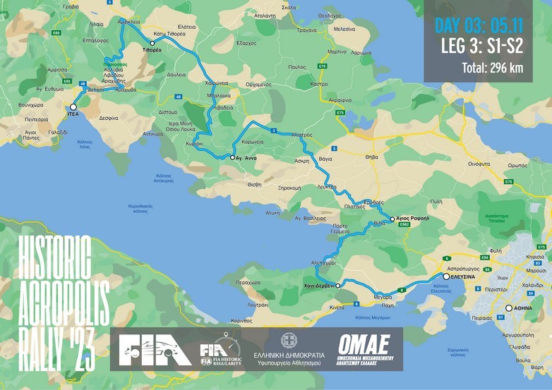 Την Κυριακή 5 Νοεμβρίου, την τρίτη και τελευταία ημέρα του αγώνα, η εκκίνηση από την Ιτέα θα δοθεί στις 09:00 και τα πληρώματα θα περάσουν από Επτάλοφο, Πολύδροσο, Χαιρώνεια, Κυριάκι, Αγία Άννα, Πλαταιές και Ερυθρές, για να φτάσουν στα Βίλια όπου θα γίνει η ανασυγκρότηση. Στο τελευταίο μέρος του αγώνα, η διαδρομή περνάει από Ψάθα, Αλεποχώρι, Χάνι και Μέγαρα, για να τερματίσει στην Ελευσίνα στις 16:00, μετά από 296 χλμ. και 8 Ειδικές Δοκιμασίες (συνολικά).