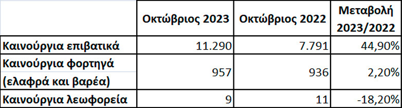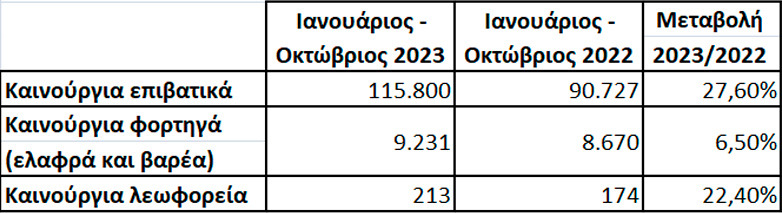 Οι ταξινομήσεις πήγαν πολύ καλά και τους δέκα πρώτους μήνες της χρονιάς. Από τον Ιανουάριο έως και το τέλος Οκτωβρίου ταξινομήθηκαν 115.800 καινούργια Ι.Χ (το αντίστοιχο διάστημα του 2022 είχαν ταξινομηθεί 90.727 Ι.Χ) . Η αύξηση σε σχέση με την περσυνή χρονιά είναι +27.6%