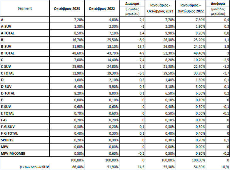 Τη μερίδα του λέοντος στις ταξινομήσεις κέρδισε και πάλι η B TOTAL κατηγορία με ποσοστό 48.6%. Ακολουθεί η C TOTAL με 32.9% και στην 3η θέση βρίσκεται η B SUV με ποσοστό 31.9%