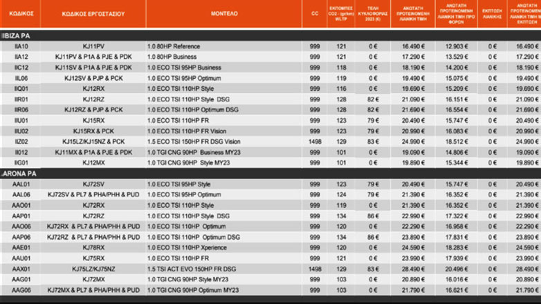 Το μικρότερο μοντέλο της γκάμας, το πασίγνωστο Ibiza με τη μοντέρνα του εμφάνιση ξεκινά από τα 16.490 ευρώ στην έκδοση με τον 1.000άρη ατμοσφαιρικό κινητήρα 80 ίππων. Στα 18.190 ευρώ η έκδοση με τον turbo 1.0 TSI των 95 ίππων, ενώ για όσους θέλουν το απόλυτο πακέτο Ibiza, με 21.090 ευρώ μπορούν να αγοράσουν την έκδοση με το αυτόματο κιβώτιο και τον 1.000άρη των 110 ίππων.