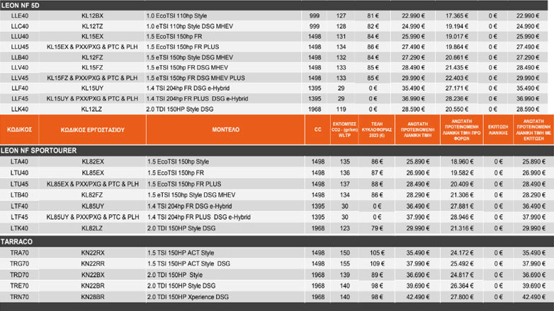 Περνώντας στην CUPRA, το Leon στην υβριδική έκδοση με τον 1.400άρη turbo κινητήρα απόδοσης 204 ίππων, κοστίζει από 39.390 ευρώ, ενώ η κορυφαία δίλιτρη έκδοση με τα 300 άλογα βρίσκεται στα 45.890 ευρώ.
