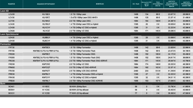 Παράλληλα, στο νέο τιμοκατάλογο CUPRA περιλαμβάνεται βελτίωση κατά 1.000€ της τιμής και του CUPRA Leon PHEV. Μία κίνηση που εμπλουτίζει τον όρο value for money, που ήδη προσφέρει το μικρομεσαίο μοντέλο.