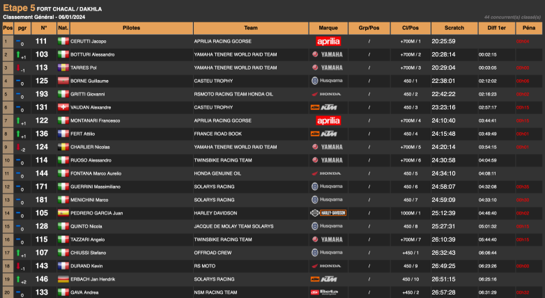 Στη γενική κατάταξη μετά το πέμπτο στάδιο ο CERRUTI με την APRILIA παραμένει στην πρώτη θέση.