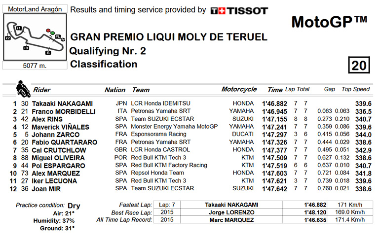 Μία άξια Pole Position κατέκτησε στην Ισπανία ο Takaaki Nakagami με Honda με χρόνο στο 1’46.882 που είναι δύο δέκατα κάτω από το χρόνο με τον οποίο είχε πάρει την πρώτη θέση των δοκιμών πέρυσι ο Marc Marquez! Είναι η πρώτη φορά που ο Ιάπωνας της Honda ξεκινάει από την πρώτη σειρά της εκκίνησης και φυσικά ήταν ιδιαίτερα ευχαριστημένος!