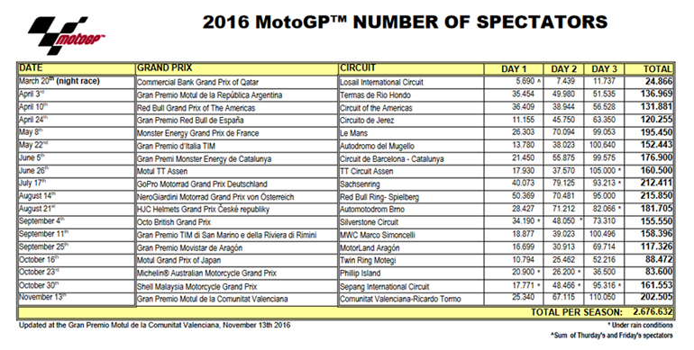 Το Brno της Τσεχίας έχει πολλές φορές αναδειχθεί σε πρωταθλήτρια πίστα στα εισιτήρια. Φέτος δεν τα Μισά εισιτήρια κόπηκαν φέτος στην Jerez συγκριτικά με το 2015…πήγε άσχημα καθώς ήταν στην 5η θέση, πίσω από το Le Mans. Βέβαια στο Brno υπήρχαν δυο παράγοντες που επηρέασαν ως ένα βαθμό την προσέλευση των θεατών: αφενός η βροχή για πρώτη φορά στα χρονικά και αφετέρου οι πάρα πολύ ακριβές τιμές εισιτηρίων.