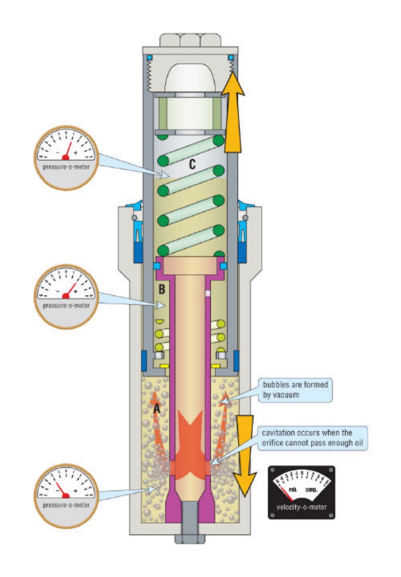 Εντός των αμορτισέρ το λάδι σε μεγάλες ταχύτητες κίνησής του και καθώς περνάει μέσα από οπές και μικρές διατομές, αρχίζει να βράζει λόγω θερμοκρασίας και υποπίεσης που δημιουργείται από τις αντιστάσεις, με ταυτόχρονη εμφάνιση μικρών δινών που λόγω υπερβολικά υψηλών τοπικών ταχυτήτων, χτυπούν αυτές οι φυσαλίδες στα τοιχώματα, στις βαλβίδες και τις οπές, προκαλώντας φθορά, ενώ το ίδιο το λάδι χάνει τις ιδιότητές του.
