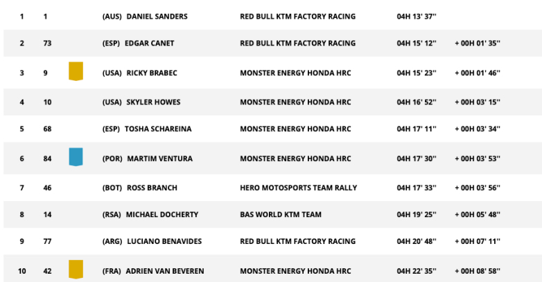 Πίσω από τους δύο αναβάτες της KTM, ο Ricky Brabec με την Honda σημείωσε τον 3ο καλύτερο χρόνο της ημέρας και παραμένει επίσης 3ος στη γενική, σε απόσταση 2’18’’ από τον πρωτοπόρο του αγώνα.