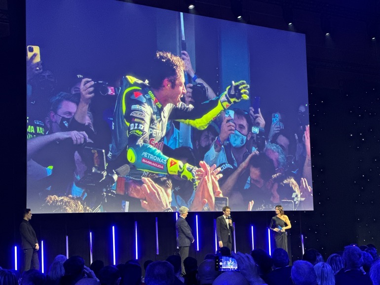 Πριν ξεκινήσει η Απονομή στους “Ultimate Champions” του 2022, ο Πρόεδρος της FIM Jorge Viegas κάλεσε στη σκηνή τον Θρύλο Valentino Rossi και του απέμεινε ένα Ειδικό Έπαθλο το FIM Special Prize. Οι 800 καλεσμένοι σηκώθηκαν όρθιοι και χειροκρότησαν θερμά και για πολύ ώρα τον οδηγό που έχει συνδέσει περισσότερο από κάθε άλλον το όνομά του με την αγωνιστική μοτοσυκλέτα, αποτίοντας ένα φόρο τιμής στον 9 φορές Παγκόσμιο Πρωταθλητή που φέτος αγωνίστηκε μόνο με τέσσερις τροχούς. Ήταν μια αποθέωση που ο ίδιος χάρηκε πάρα πολύ, παρά το ότι δεν αισθάνεται άνετα όταν κλέβει την παράσταση από κάτι άλλο όπως το κύριο γεγονός που ήταν η Απονομή στους φετινούς Παγκόσμιους Πρωταθλητές. Για αυτό το λόγο έφυγε αμέσως μετά το τέλος της Τελετής, ώστε να μην τραβήξει άλλο την προσοχή!