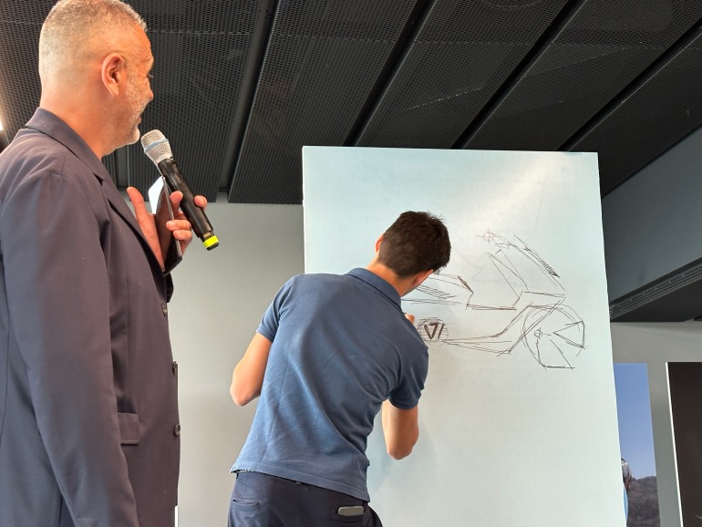 Ο νεαρός σχεδιαστής Daniele Mazzon κλήθηκε από τον πανέξυπνο CEO της Ιταλικής VMOTO να αποκαλύψει κάποια πράγματα για το σχεδιασμό που έγινε και μετά τις τελευταίες δοκιμές στην ιδιωτική αεροσήραγγα της Pininfarina S.p.A. Και εκείνος ανταποκρίθηκε ζητώντας ένα άσπρο φόντο από το πίσω μέρος μιας διαφημιστικής πινακίδας, πάνω στο οποίο σχεδίασε τις βασικές γραμμές, που όπως εξήγησε δεν είναι μόνο η προσωπική του σφραγίδα στο πρότζεκτ, αλλά το αποτέλεσμα της δουλειάς όλου του περίφημου σχεδιαστικού οίκου.