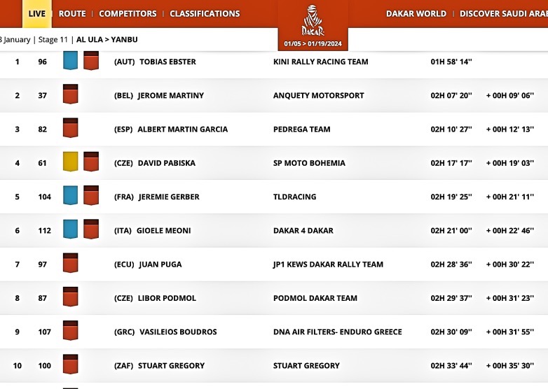 Ο Έλληνας Βασίλης Μπούδρος που συμμετείχε στον Αγώνα με μια Husqvarna με το #107 στη σημερινή Ειδική Διαδρομή, πήγε εξαιρετικά και για άλλη μια φορά ήταν στη δεκάδα της κατηγορίας του, ενώ είχε και πολύ καλή θέση στη γενική κατάταξη της 12ης Ειδικής. Με την 9η θέση στην κατηγορία “Original by Motul” (η κατηγορία όπου κάθε οδηγός είναι μόνος του, χωρίς κανένα μηχανικό ή άλλο άτομο για να τον βοηθήσει!), την 43η θέση στην κατηγορία “Rally 2” και την 58η στην Γενική, στα συνολικά αποτελέσματα του Αγώνα κέρδισε μια θέση σε σχέση με χθες και είναι στην 17η θέση στην “Original by Motul”, στην 65η στην R2 και στην 81η θέση της Γενικής κατάταξης. Είναι ένας μεγάλος άθλος ο τερματισμός του και η συνολική του παρουσία είναι πολύ καλή, ενώ έφτασε και μέχρι την 4η θέση της κατηγορίας του σε μια Ειδική. Η Ελληνική σημαία στο Dakar 2024 είναι κάτι σημαντικό για το μηχανοκίνητο αθλητισμό της χώρας μας.