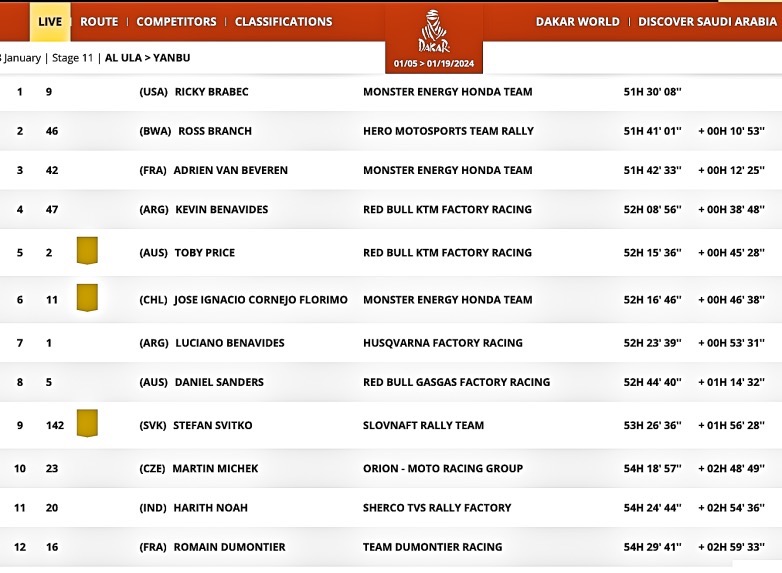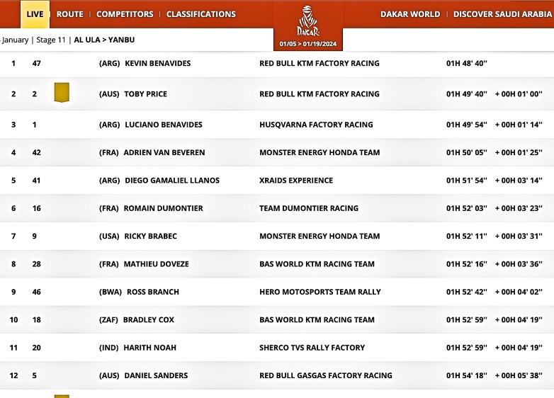 Η 46η έκδοση του Dakar σίγουρα ενισχύει την αξία της Honda, γιατί εκτός από τον Brabec στο βάθρο υπάρχει χώρος και για τον Adrien Van Baveren, ο οποίος πέτυχε την τρίτη θέση μόλις 12′ πίσω από τον ομόσταυλό του. Μεταξύ των δύο οδηγών του HRC ξεχωρίζει ένας σούπερ Ross Branch. Επίσης όλοι έβγαλαν το καπέλο για το τι έκανε ο αναβάτης της Ινδικής Hero, ο οποίος έπαιξε για τον θρίαμβο στο Ράλι στο αραβικό έδαφος, μέχρι το τέλος. Η Μποτσουάνα είναι υπερήφανη για τον οδηγό της, που ήταν σίγουρα μια από τις αποκαλύψεις αυτής της έκδοσης του Dakar, σε σημείο να επιβεβαιωθεί η στενή επαφή του με την κορυφή για όλη τη διάρκεια του αγώνα. Σημαντικό σημάδι ενόψει της επόμενης έκδοσης. Αξιοσημείωτη είναι η απουσία των KTM στο βάθρο. Αν και μέχρι πριν από λίγα χρόνια κυριαρχούσε ο Αυστριακός κατασκευαστής, αυτή τη φορά το Dakar αφήνει μια άσχημη γεύση στα στόματα των οδηγών του 450 Rally σε τέτοιο βαθμό που πρέπει να παρηγορηθούν με την τέταρτη θέση του Kevin Benavides, νικητή. της τελευταίας Ειδικής.