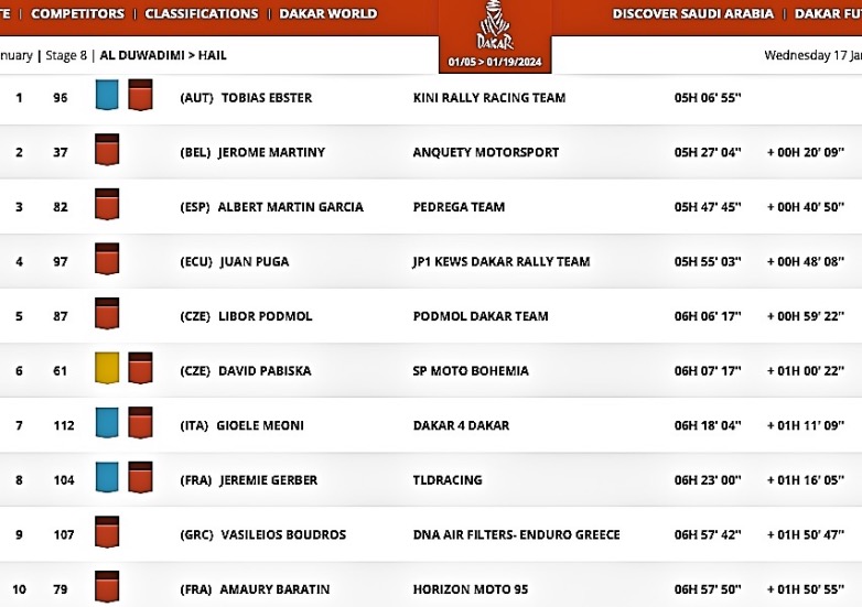 Ο Έλληνας Βασίλης Μπούδρος που συμμετέχει στον Αγώνα με μια Husqvarna με το #107 στη σημερινή Ειδική Διαδρομή, βρέθηκε και πάλι σε καλές θέσεις σε αυτήν την 9η Ειδική και με την 9η θέση στην κατηγορία “Original by Motul” (η κατηγορία όπου κάθε οδηγός είναι μόνος του, χωρίς κανένα μηχανικό ή άλλο άτομο για να τον βοηθήσει!), την 50η θέση στην κατηγορία “Rally 2” και την 67η στην Γενική, στα συνολικά αποτελέσματα του Αγώνα είναι, όπως και χθες, στην 18η θέση στην “Original by Motul”, στην 66η στην R2 και στην 83η θέση της Γενικής κατάταξης.