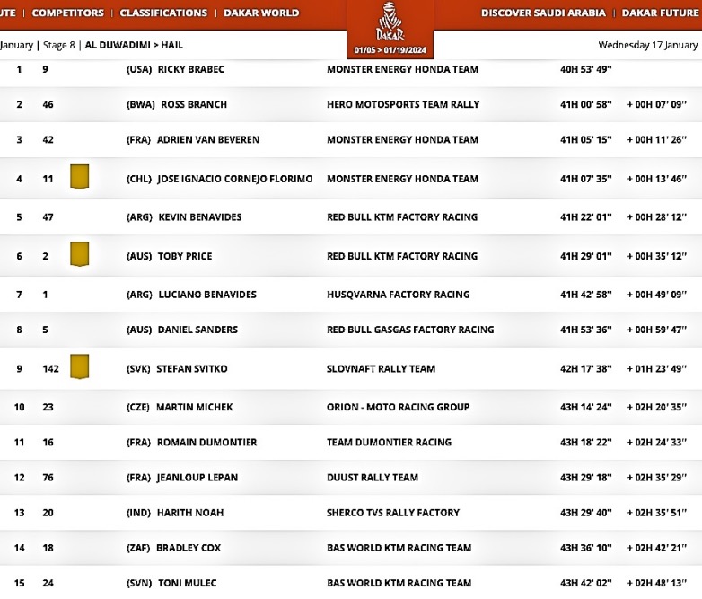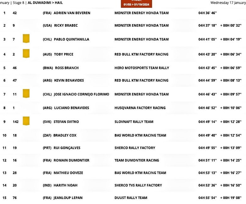 Η ακραία αντοχή ωθεί τους ανταγωνιστές στα όρια από σωματική άποψη. Το Dakar είναι επίσης ένας αγώνας μηχανοκίνητου αθλητισμού στον οποίο τα τεχνικά προβλήματα μπορεί να έχουν μεγάλο κόστος και όπου οι δυσκολίες πλοήγησης επιβαρύνουν τη φαιά ουσία του καθενός, χωρίς να ξεχνάμε, φυσικά, την ικανότητα οδήγησης, η οποία σπάνια μπορεί να κάνει τη διαφορά από μόνη της. Για να ολοκληρωθεί ο καμβάς, η στρατηγική παίζει πρωταρχικό ρόλο, ιδιαίτερα όταν ο ορίζοντας της τελικής γραμμής τερματισμού είναι ξεκάθαρος. Η αντίστροφη μέτρηση είχε ήδη ξεκινήσει χθες, με τον Adrien Van Beveren να ακούγεται στο αστείο που περιελάμβανε τους αντιπάλους του να πατούν φρένο για να φύγουν πολύ πίσω του σήμερα. Η αντίδραση του άνδρα από τη Βόρεια Γαλλία, με την περηφάνια του πληγωμένη, ήταν ίση με το ταλέντο του, ακόμη και σε εδάφη που δεν του ταιριάζει καλύτερα. Οδήγησε την Ειδική σε μεγάλο μέρος της απόστασης, πλοηγώντας τέλεια, διατηρώντας παράλληλα υψηλό ρυθμό, επιτρέποντάς του να ανακτήσει τη θέση του στο προσωρινό βάθρο. Ο Van Beveren εκπλήρωσε μέρος της συμφωνίας, αλλά πρέπει ακόμα να συμπληρώσει 11’16” για να πιάσει τον συνάδελφό του στην Honda, Ricky Brabec. Ο Αμερικανός ήταν ο κύριος ωφελούμενος στην 9η Ειδική της, επειδή η αρχική του θέση (7η) του επέτρεψε να σημειώσει γρήγορη πρόοδο στην AlUla και να αυξήσει το προβάδισμά του στη γενική κατάταξη. Καθώς ο άνεμος άλλαζε υπέρ του, ο Καλιφορνέζος εκμεταλλεύτηκε επίσης τα λάθη πλοήγησης του Ross Branch με την Hero, του οποίου τώρα προηγείται με 7’09”. Συνολικά, ο Brabec δεν έχει κερδίσει ούτε μια Ειδική, αλλά τερμάτισε 2ος, όπως σήμερα, σε τέσσερις περιπτώσεις, κάτι που θα μπορούσε να είναι η φόρμουλα νίκης για τον Αγώνα του 2024!