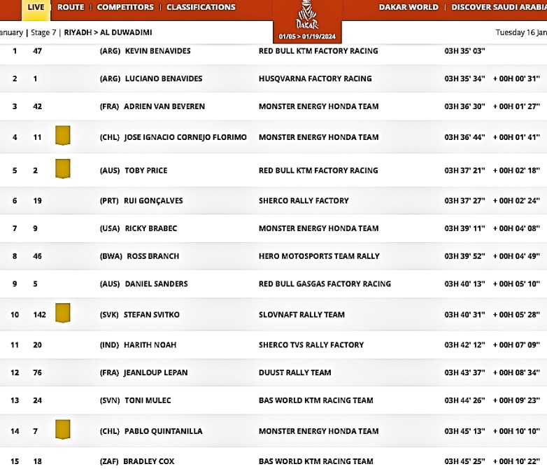 Μπροστά τους, η συναρπαστική μάχη είναι καλά και πραγματικά σε εξέλιξη μεταξύ τουλάχιστον των δύο πρώτων, που στο ξεκίνημα τους χώριζε μόλις ένα δευτερόλεπτο. Λαμβάνοντας υπόψη τις ενδιάμεσες βαθμολογίες κατά τη διάρκεια της Ειδικής, είναι λογικό να πιστεύουμε ότι η στρατηγική του να κόβουν λίγο ρυθμό, χρησίμευσε ως σημείο αναφοράς για τους διεκδικητές του τίτλου. Έχοντας πρωτοστατήσει στο μεγαλύτερο μέρος των ειδικών, ο Αμερικανός ηγέτης της γενικής κατάταξης, ο Ricky Brabec τερμάτισε τελικά με τον 7ο καλύτερο χρόνο, φέρνοντάς τον σε πλεονεκτική θέση εκκίνησης για το αυριανό ετάπ, ενώ ο Ross Branch πήγε ένα βήμα πίσω με την 8η θέση, αλλά η διαφορά τους εξακολουθεί να είναι αμελητέα, με 42” δευτερόλεπτα υπέρ της Honda σε σχέση με την Hero. Ο Adrien Van Beveren, ο οποίος ένιωσε το πρόβλημα λίγο αργά, κληρονόμησε την 3η θέση που μπορεί να μην του κάνει καλό όταν όλοι οι συνάδελφοί του στην Honda θα είναι ζεστοί στο δρόμο για την AlUla.