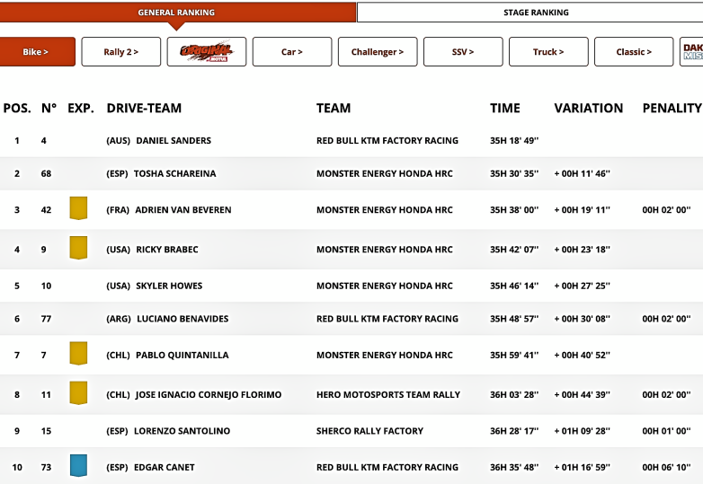 Ο υπερασπιστής του τίτλου, Ricky Brabec, άφησε την εμπειρία του να μιλήσει. Κατέκτησε την 11η νίκη του στην καριέρα του στην Ειδική, με διαφορά 23 δευτερολέπτων από τον συναθλητή του Adrien Van Beveren και ανέβηκε δύο θέσεις στην γενική κατάταξη, φτάνοντας στην 4η θέση. Ο Γάλλος έδωσε ένα σεμινάριο πλοήγησης και μάζεψε όλα τα μπόνους χρόνου που ήταν διαθέσιμα για τον πρώτο αναβάτη στη διαδρομή, εξασφαλίζοντας τη θέση του στην 3η θέση της γενικής κατάταξης, με διαφορά 1′11″ από τον επικεφαλής, Daniel Sanders.