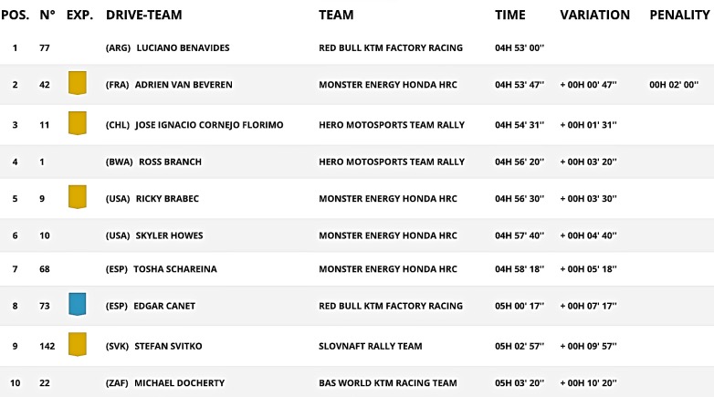 Την πεντάδα έκλεισε ο Ricky Brabec, ο οποίος τερμάτισε την ημέρα 10 δευτερόλεπτα πίσω από τον Branch. Στη γενική κατάταξη, ο Daniel Sanders της KTM (ο οποίος τερμάτισε 12ος μετά από ποινή 8 λεπτών λόγω υπερβολικής ταχύτητας) παραμένει στην κορυφή της κατάταξης για το Dakar 2025 στην κατηγορία των μοτοσυκλετών. Με συνολικό χρόνο 30:20:15, ο Αυστραλός κατευθύνεται προς την ημέρα ξεκούρασης με διαφορά 07:02 από τον Toscha Schareina της Honda.
