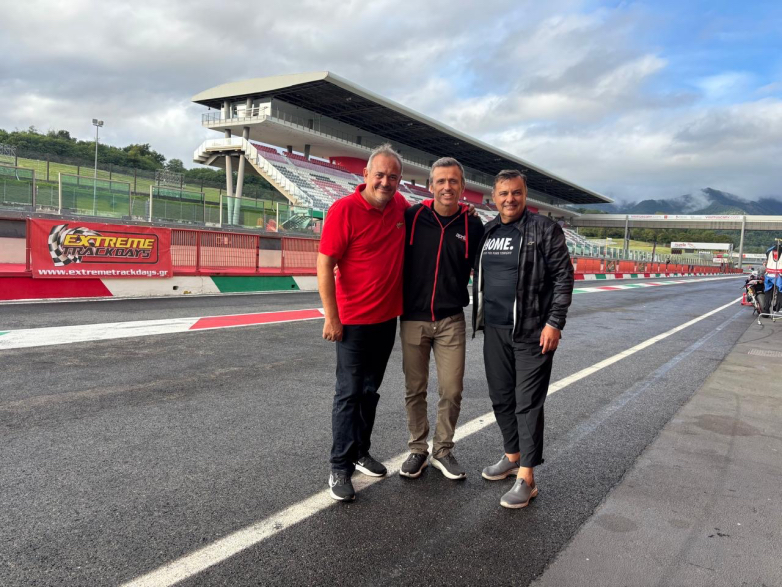 Ο Σωτήρης Ζαφειρόπουλος (αριστερά) της Extreme Track Days φρόντισε για τα οργανωτικά, ο Fabio Gilardenghi (κέντρο) ήρθε από το Noale, την έδρα της Aprilia και ο δοκιμαστής μας Δημήτρης Διατσίδης, στην καλύτερη πίστα του κόσμου.