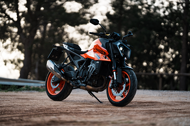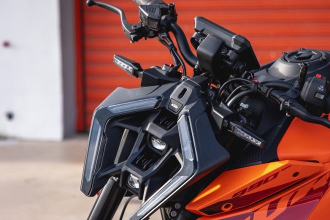 Από νωρίς με το φως να βοηθά τις στατικές φωτογραφίες, βλέποντας την KTM 990 Duke δεν μπορεί να μην προσέξει κανείς τις τόσες λεπτομέρειες στον σχεδιασμό αυτής της μικρής και συμπαγούς μοτοσυκλέτας που σε κερδίζει αμέσως γνωρίζοντας ότι είναι φτιαγμένη και για την πίστα και όχι απλά για να κινείται με ευελιξία στο δρόμο. Επιθετική και με έντονες γωνίες, προκαλεί με την εμφάνισή της να την οδηγήσεις και μάλιστα με γρήγορο ρυθμό χωρίς πολλές καθυστερήσεις.