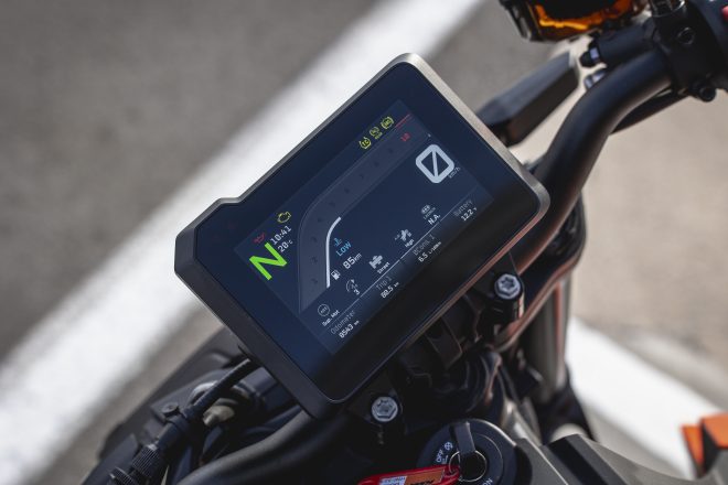 Η χρονομέτρηση των γύρων με τη βοήθεια της ευκρινούς οθόνης 5” TFT βοήθησε στην ανάγνωση του χρόνου και η σταθερή βελτίωσή του μας έδωσε το κίνητρο να κάνουμε αρκετούς γύρους στην πίστα αλλά και να δούμε τα στατιστικά μετά από κάθε δοκιμή με τις μέγιστες κλίσεις και τη μέγιστη ταχύτητα στην ευθεία. Η μέγιστη κλίση με αυτά τα ελαστικά δρόμου ήταν στις 49°. Φυσικά οι ρυθμίσεις του ελέγχου της πρόσφυσης είναι διαθέσιμες και τα ηλεκτρονικά λειτουργούν άψογα καθώς δεν άφησαν την ελαφριά μοτοσυκλέτα να κάνει κάποια απότομη αντίδραση, ενώ επέτρεπαν το μικρό σπινάρισμα του πίσω τροχού. Αντίστοιχα στο φρενάρισμα οι ρυθμίσεις επιτρέπουν την πλαγιολίσθηση με το πίσω φρένο στις εισόδους των στροφών, με τον κινητήρα να διατηρεί το φρενάρισμα με σταθερή ολίσθηση του πίσω τροχού, ενώ και ο συμπλέκτης ολίσθησης βοηθά στο κατέβασμα ταχυτήτων χωρίς να αυξάνει στιγμιαία την ολίσθηση στον πίσω τροχό και χωρίς να ανεβάζει πολύ τις στροφές του κινητήρα.
