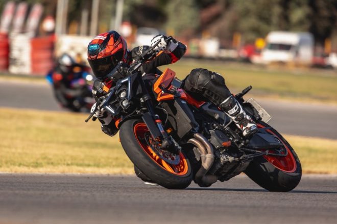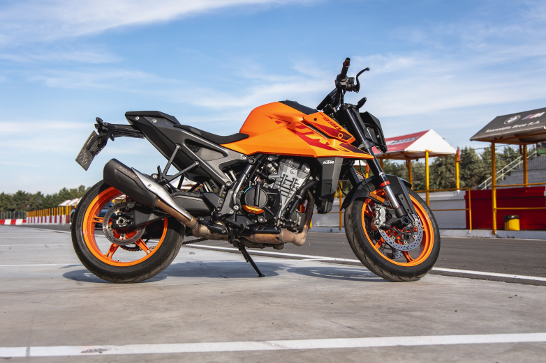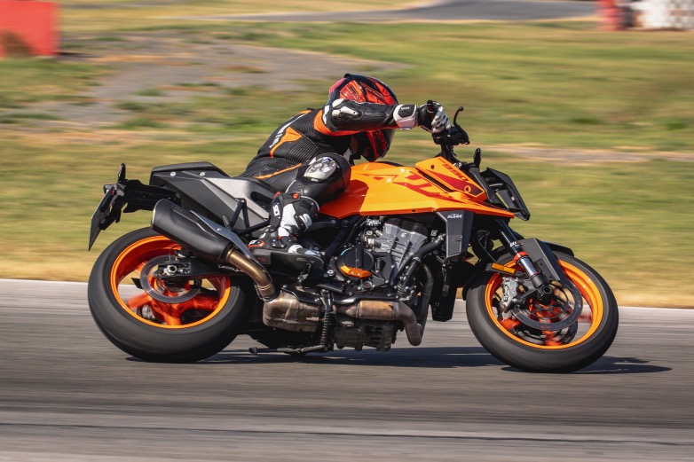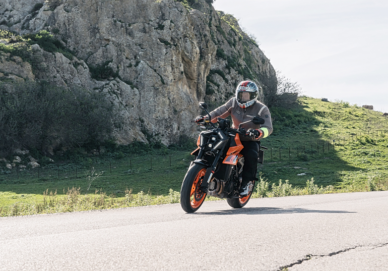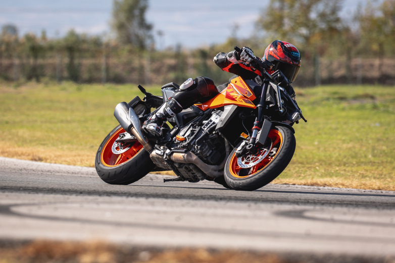 Αυτό που σε κερδίζει στην KTM 990 Duke είναι η ευελιξία μαζί με τη θέση οδήγησης που είναι λίγο χαμηλή συνολικά και βοηθάει στις μεγάλες κλίσεις τα γόνατα να έρθουν γρήγορα σε επαφή με την άσφαλτο χωρίς ωστόσο να βρίσκονται τα ελαστικά σε οριακό σημείο πρόσφυσης. Έτσι ο αναβάτης που δεν είναι πολύ έμπειρος αισθάνεται ασφάλεια και στρίβει με μεγάλες κλίσεις χωρίς κουνήματα και μικρά γλιστρήματα, κάτι που βοηθά σε σταθερό χρόνο γύρου και διατήρηση της ιδανικής γραμμής στην πίστα χωρίς απόκλιση της πορείας.