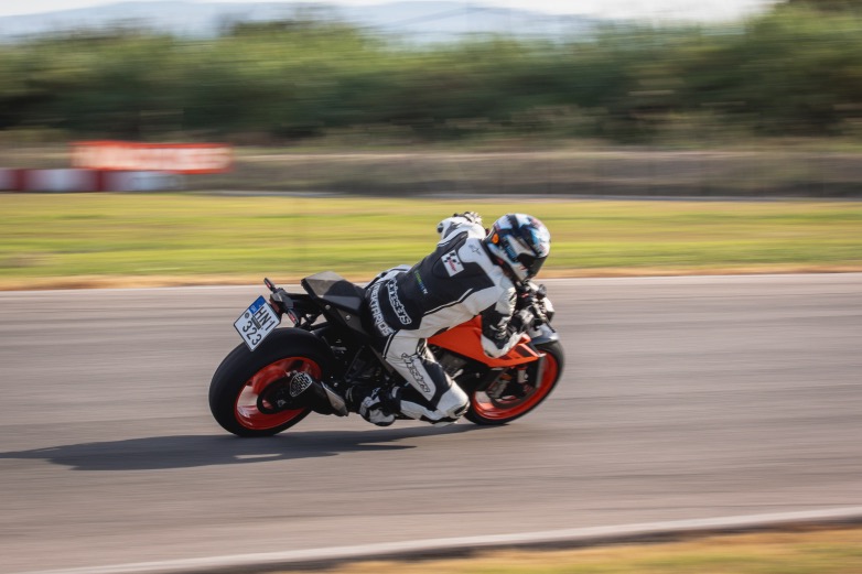 Η KTM 990 Duke ζυγίζει 179 κιλά χωρίς καύσιμο και με 14 κιλά επιπλέον από το γεμάτο ντεπόζιτο, οι πρώτοι γύροι στην πίστα είναι περισσότερο αναγνωριστικοί με την χρονομέτρηση να έρχεται δεύτερη στο μυαλό αφού δεν είναι απαραίτητα η επίθεση χρόνου που θα δώσει την ευχαρίστηση στην οδήγηση, αλλά οι στροφές με τα γόνατα να ακουμπούν εύκολα στην άσφαλτο και η ιδανική γραμμή να διατηρείται σαν να είναι παιχνίδι η επιλογή της και όχι προσπάθεια από τον έμπειρο αναβάτη.