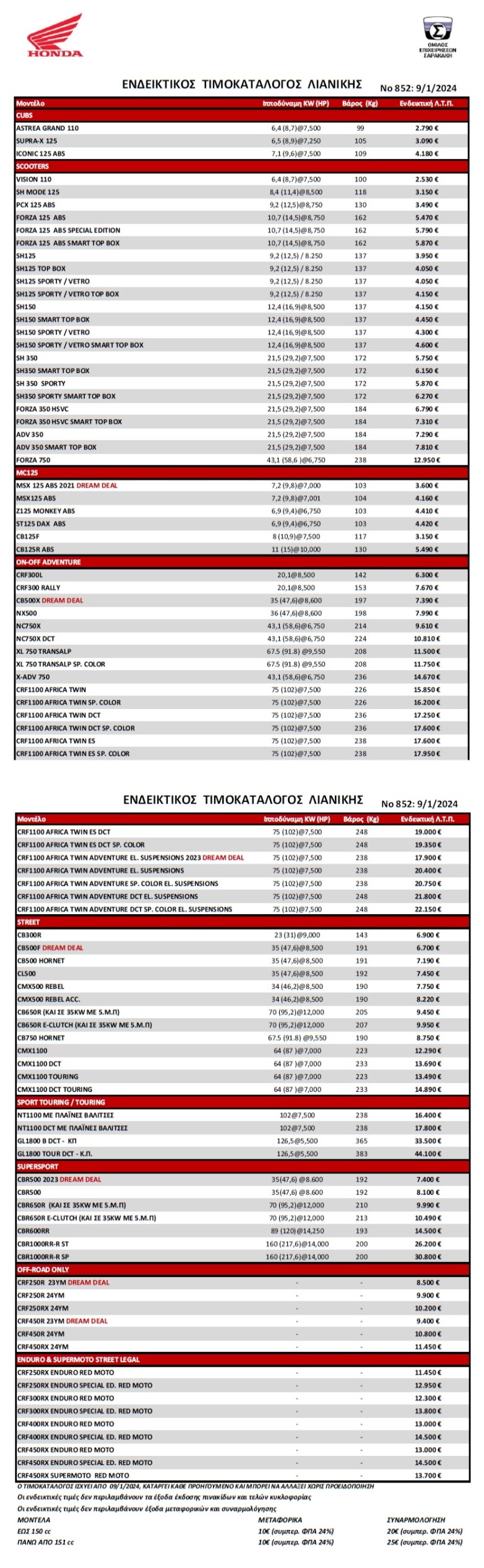 H Honda Motorcycles ανακοίνωσε το νέο τιμοκατάλογο 2024 με τις προσφορές Dream Deals, που δίνουν τη δυνατότητα στους λάτρεις της μάρκας να αποκτήσουν τώρα την Honda των ονείρων τους και να ζήσουν την εμπειρία της οδήγησης του αγαπημένου τους μοντέλου.