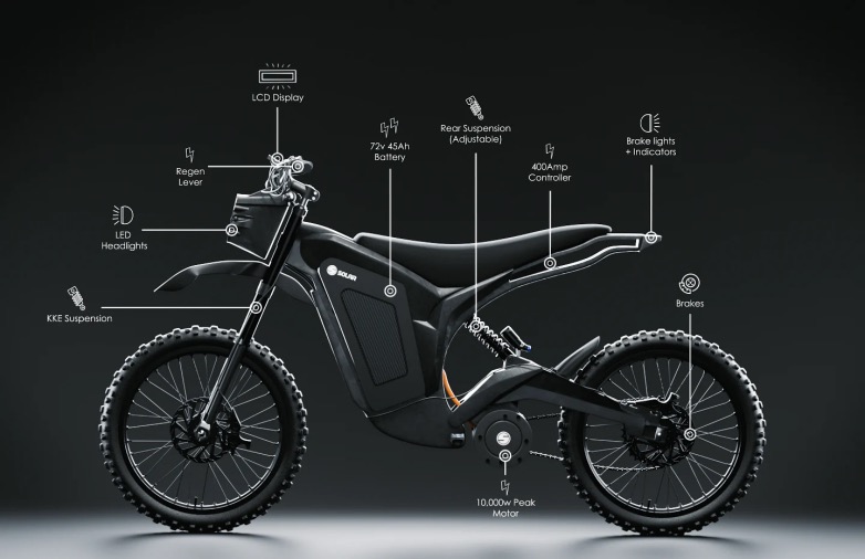 Είναι η ανάρτηση για μεγάλη διαδρομή και ένας ηλεκτρικός κινητήρας τοποθετημένος στη μεσαία τριβή (έδραση στην εμπρός άρθρωση του ψαλιδιού), ικανός να ωθήσει αυτή την κατασκευή σε τελική ταχύτητα 105 χλμ./ώρα. Για αναφορά, έχει μέγιστη ισχύ εξόδου 13 κιλοβάτ, ή περίπου 17 ίππους. Όσον αφορά την μπαταρία, αυτή είναι 72 volt, με 45 Ah και μεγάλη αυτονομία 112 χλμ. με μία μόνο φόρτιση, με τα Solar Scooters να διεκδικούν χρόνο επαναφόρτισης λιγότερο από τρεις ώρες μέσω μιας τυπικής οικιακής πρίζας.
