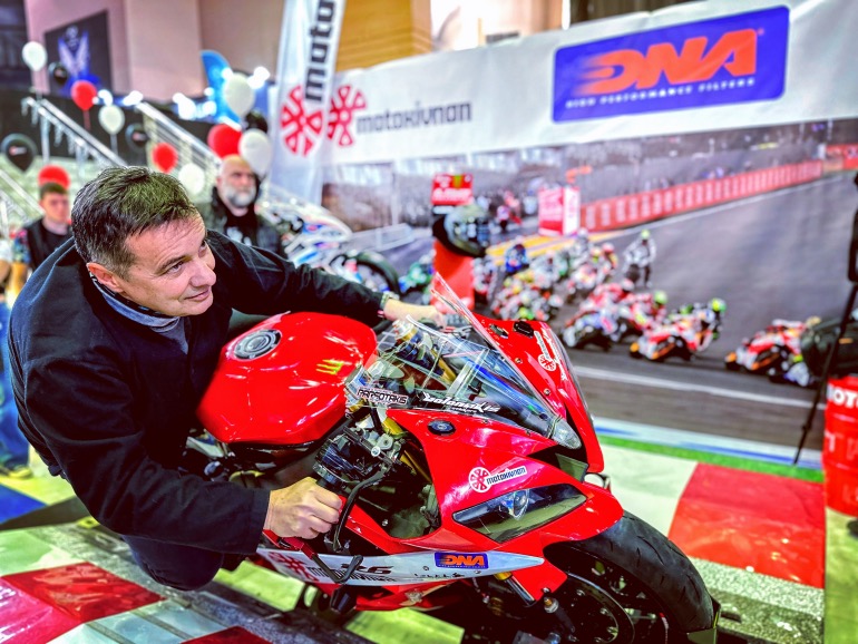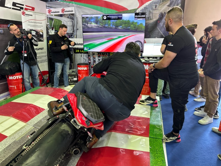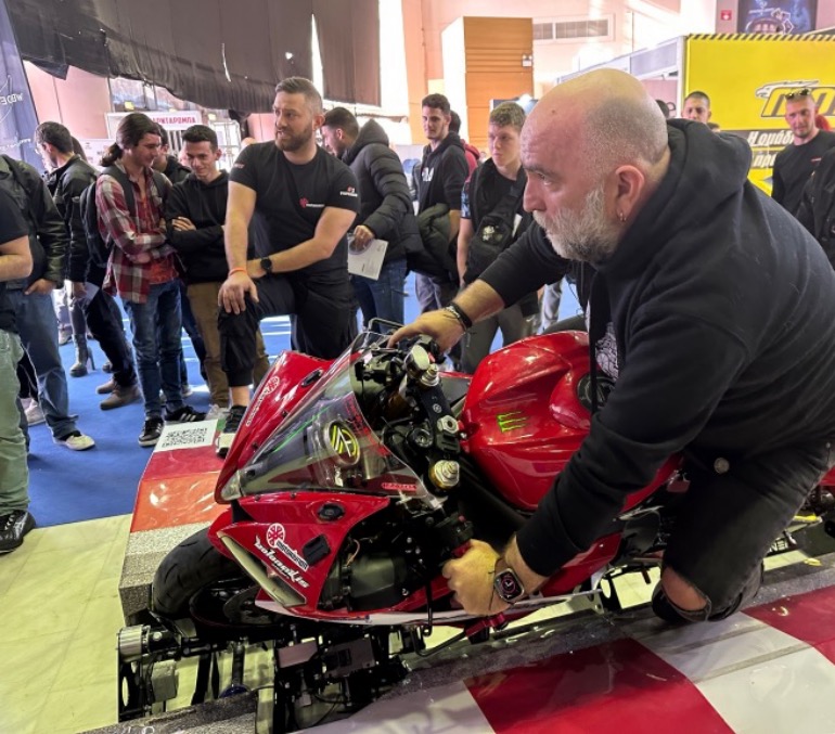 Μια από τις ευχάριστες εκπλήξεις της “ΕΚΘΕΣΗΣ ΜΟΤΟΣΥΚΛΕΤΑΣ 2023”, που γίνεται στο Εκθεσιακό Κέντρο – Κλειστό Γήπεδο Π. Φαλήρου (πρώην TAE KWON DO), βρίσκεται ακριβώς μόλις μπαίνεις στην Έκθεση στο δεξί μέρος και είναι ένας πραγματικά υψηλού επιπέδου εξομοιωτής οδήγησης, που είναι προσαρμοσμένος σε μια μοτοσυκλέτα Yamaha R6. Ανεβαίνεις στη μοτοσυκλέτα που συνδεμένη με τους ειδικούς μηχανισμούς, δουλεύει ως προς τις αναρτήσεις, με το μπροστινό να βυθίζεται στο φρενάρισμα και το πίσω στην επιτάχυνση, με δυνατότητα πλαγιάσματος με τον τρόπο που το κάνεις σε μια πίστα και με αντιδράσεις “κανονικές”, καθώς στο άνοιγμα του γκαζιού βοηθάς τη μοτοσυκλέτα να πάρει τη σωστή γραμμή στην πίστα. Στην οθόνη ο Θοδωρής Τζήμας της Μοτοκίνησης – που έχει φέρει τον εξομοιωτή στην Ελλάδα – έχει επιλέξει την πίστα του Μουτζέλο, που είναι μια πίστα με ωραία ροή οδήγησης. Στο μέλλον θα περάσουν στο σύστημα και την πίστα των Σερρών!!!