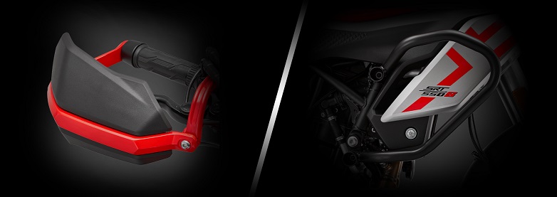 Η νέα σχάρα έχει πρόβλεψη για τοποθέτηση Top Case και για πλαϊνές βαλίτσες, ενώ οι χούφτες στο τιμόνι με αλουμινένια μπάρα και περιμετρικά κάγκελα για τον κινητήρα και το φαίρινγκ είναι στον στάνταρ εξοπλισμό.