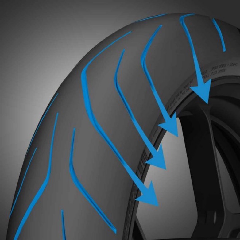 Η αντίστροφη φορά της χάραξης του εμπρός ελαστικού από αυτή του πίσω, δεν έχει στόχο απλώς τον εντυπωσιακό σχεδιασμό, αλλά είναι μια μελετημένη σχεδίαση με πολλά φαινόμενα να συμβαίνουν και πολλούς συμβιβασμούς με στόχο τη βέλτιστη δυνατή απόδοση.