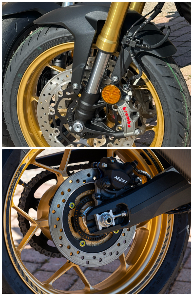 Μια ειδική αντλία φρένου ελέγχει τις δύο ακτινικά τοποθετημένες τετραπίστονες δαγκάνες Brembo Stylema που συνδυάζονται με πλευστούς δίσκους 310mm. Ο πίσω δίσκος των 240mm ελέγχεται από μονοπίστονη δαγκάνα της Nissin.