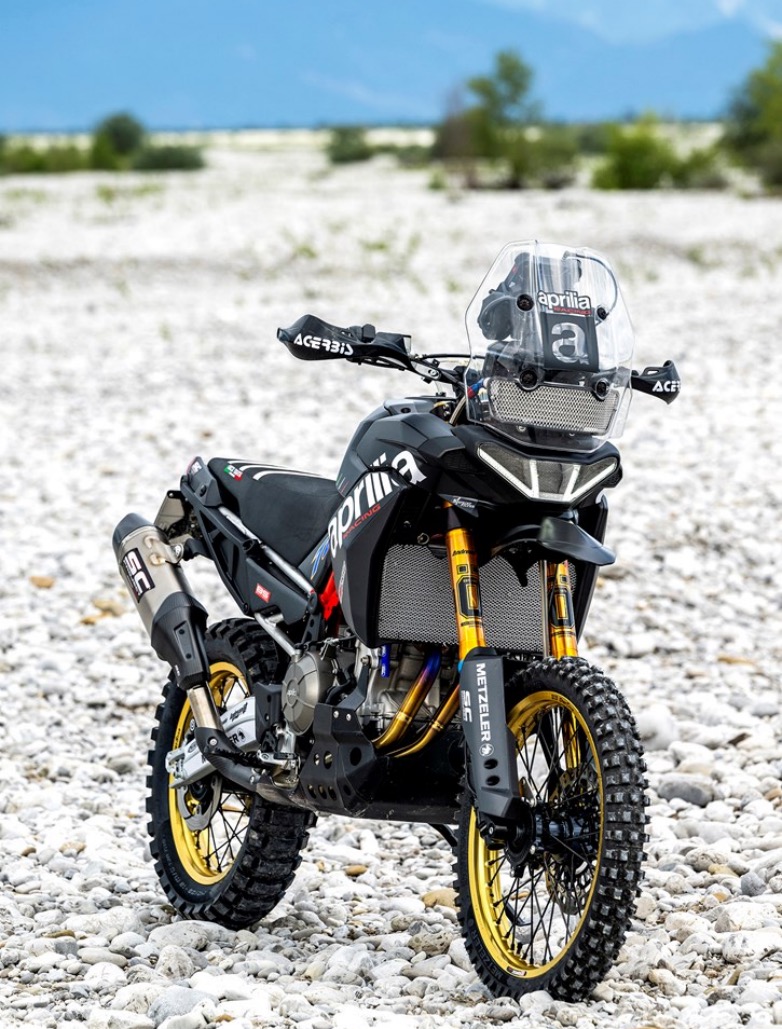 Η αγωνιστική έκδοση της Aprilia Tuareg διαθέτει αναρτήσεις Öhlins by Andreani, πλήρη εξάτμιση τιτανίου SC Project και ειδικό φίλτρο αέρα Sprint Filter. Ανεκτίμητη ήταν και η συνεργασία με την Metzeler, η οποία δείχνει αυξανόμενο ενδιαφέρον για τον κόσμο των δικύλινδρων adventure και έχει επιλέξει την Aprilia για την ανάπτυξη προϊόντων για μελλοντική χρήση σε rally raid.