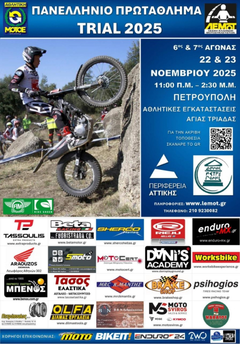 Η Λ.Ε.ΜΟΤ. διοργανώνει τους δύο τελευταίους αγώνες του Πανελλήνιου Πρωταθλήματος Trial 2025, το Σάββατο 22 και την Κυριακή 23 Νοεμβρίου 2025, σε χώρο δίπλα στις αθλητικές εγκαταστάσεις Αγίας Τριάδας του Δήμου Πετρούπολης.
