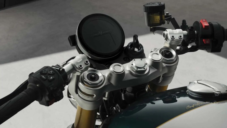 Σύμφωνα με την Triumph, η νέα Cafe Racer Edition είναι “τέχνη εν κινήσει”, κάτι που φαίνεται απλώς κοιτώντας τις φωτογραφίες, οπότε σίγουρα θα είναι ακόμη πιο εντυπωσιακή από κοντά, ειδικά όταν κινείται. Η εξωτερική εμφάνιση περιλαμβάνει χαμηλά τιμόνια clip-on, ένα νέο πίσω κάλυμμα που κρύβει τη σέλα του συνεπιβάτη και πιο αεροδυναμικό σχήμα. Υπάρχουν επίσης καθρέφτες στα άκρα του τιμονιού, αποκλειστικός χρωματισμός Competition Green και Aluminium Silver, πινελιές από γυαλιστερό αλουμίνιο παντού, το γραφικό νούμερο “12” στα πλαϊνά και μια χρυσή γραμμή Empire Gold που διατρέχει τη μοτοσυκλέτα, χωρίζοντας τα χρώματα. Για όσους θέλουν να κινούνται και με συνεπιβάτη, η Triumph αναφέρει ότι τα σχετικά εξαρτήματα θα περιλαμβάνονται στο κιβώτιο παραλαβής, ώστε οι ιδιοκτήτες να μπορούν να αντικαταστήσουν το πίσω μέρος της σέλας όποτε το επιθυμούν.