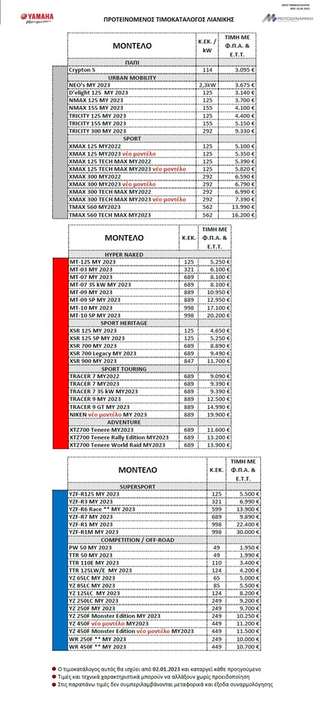 Ο τιμοκατάλογος μοτοσυκλετών της Yamaha για το 2023 περιλαμβάνει και τις τιμές των παρακάτω νέων μοντέλων: