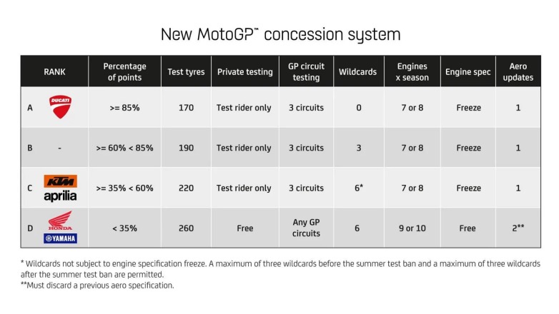 Έτσι η Ένωση Κατασκευαστών του MotoGP, η MSMA μαζί με την Dorna προχώρησαν σε ένα νέο σύστημα παραχωρήσεων, ώστε να βοηθηθούν οι πιο αδύναμοι (από πλευράς αποτελεσμάτων) κατασκευαστές και να υπάρξει μεγαλύτερη ισορροπία στα επόμενα πρωταθλήματα του 2024 και 2025.