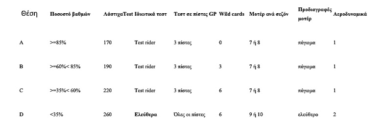 Εγκρίθηκε από την Επιτροπή Grand Prix πριν από το GP της Βαλένθια, και το νέο σύστημα καλύπτει τις ημέρες δοκιμών και τους αναβάτες, τις εμφανίσεις δοκιμαστών αναβατών, τον αριθμό των κινητήρων, τις προδιαγραφές και τα παγώματα στις αλλαγές του κινητήρα, τις αναβαθμίσεις των αεροδυναμικών πακέτων και τον αριθμό των ελαστικών που παρέχονται για δοκιμή. Τα εργοστάσια θα ταξινομηθούν σε τέσσερις ομάδες – A, B, C ή D – ανάλογα με το ποσοστό των πιθανών μέγιστων βαθμών κατασκευαστή που έχουν συγκεντρώσει σε κάθε χρονικό παράθυρο.