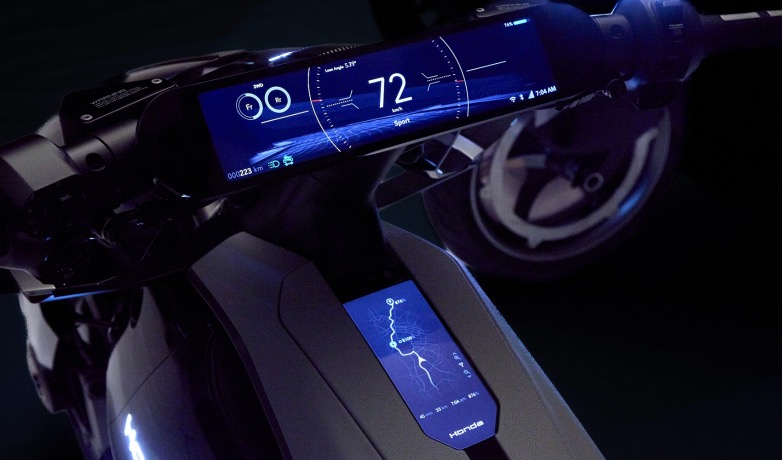 «Ο πίνακας οργάνων διαθέτει λεπτή και φαρδιά διάταξη, προσφέροντας ευρύ οπτικό πεδίο, ενώ οι καθρέφτες με κάμερες ενισχύουν την καθαρή και φουτουριστική αισθητική. Το GUI έχει σχεδιαστεί ώστε να προβάλλει διαισθητικά βασικές πληροφορίες, όπως η γωνία κλίσης της μοτοσυκλέτας, ενισχύοντας τη σύνδεση αναβάτη και μηχανής. Με τη μείωση των μη απαραίτητων πληροφοριών και ένα εύχρηστο σύστημα ελέγχου, ενισχύεται η αίσθηση εμβύθισης και η ομαλή, “gliding” εμπειρία οδήγησης».