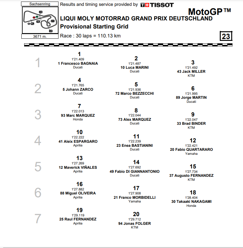 O Marc Marquez θα ξεκινήσει από την τρίτη σειρά της εκκίνησης, μπροστά από τον αδερφό του, Alex Marquez και τον Brad Binder, ενώ στην 4η σειρά βρίσκουμε τους Aleix Espargaro, Enea Bastianini και Fabio Quartararo.