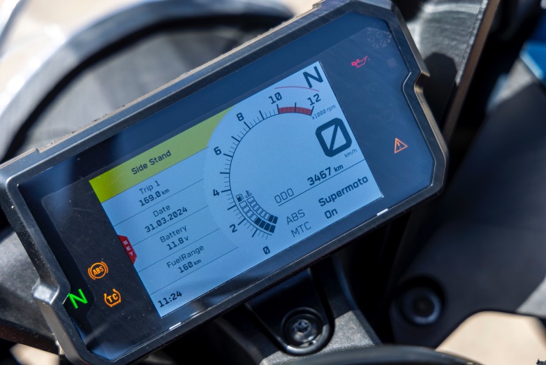 Από την πλευρά των ηλεκτρονικών, αρχικά να πούμε ότι η ευανάγνωστη οθόνη TFT σου δίνει την πληροφόρηση για τα βασικά και μπορείς να βλέπεις καλά το πως και πόσο ανεβαίνουν οι στροφές του κινητήρα, για να κάνεις τις σωστές αλλαγές ταχυτήτων. Μπορείς να βλέπεις και την επέμβαση του ΜΤC (Motorcycle Traction Control) που αναλαμβάνει να επέμβει σε χιλιοστά του δευτερολέπτου, όταν αρχίζει ο πίσω τροχός να γυρνάει με περισσότερες στροφές από ότι πρέπει και μπορεί να οδηγήσει σε ανώφελο σπινάρισμα. Το MTC επεμβαίνει πολύ μαλακά, στις βαλβίδες του γκαζιού, μειώνοντας τη δύναμη. Ένα χρήσιμο πράγμα σε γλιστερούς δρόμους ή σε βροχή, αλλά και σε καλή άσφαλτο στην πίστα όταν τέρμα πλαγιασμένος ανοίξεις το γκάζι πιο απότομα από όσο πρέπει. Στα χρήσιμα ηλεκτρονικά για την πίστα μπορούμε να αναφέρουμε και το cornering ABS που σε βοηθά να μαθαίνεις να χρησιμοποιείς τα φρένα μέχρι μέσα στη στροφή, μειώνοντας τον κίνδυνο μπλοκαρίσματος και γλιστρήματος του μπροστινού. Στη λειτουργία του ABS υπάρχει και το Supermoto ABS, που απενεργοποιεί το ABS του πίσω τροχού, επιτρέποντας στον οδηγό να πλασάρει τη μοτοσυκλέτα στη στροφή και με τη χρήση του πίσω φρένου.