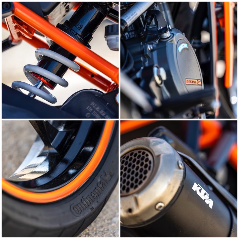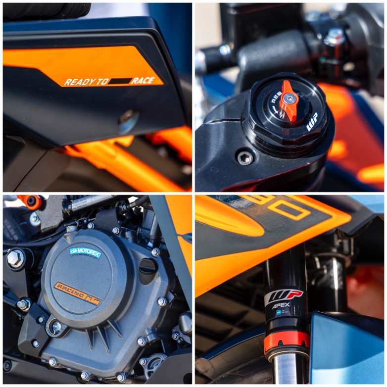 Το ρεζερβουάρ μάλιστα έχει καταγωγή από αυτό της Moto 3, στην οποία οι Αυστριακοί πρωταγωνιστούν. Ακόμη και οι καθρέφτες έχουν σχεδιαστεί με σημασία στις αεροδυναμικές λεπτομέρειες και έχουν εύκολο κλείσιμο, αν κάποιος χρειαστεί να περάσει ανάμεσα σε αυτοκίνητα στην πόλη. Μιλώντας για την πόλη, μπορείς να έχεις τα κλιπ-ον 10 mm ψηλότερα για να έχεις την άνεση που θέλεις και στην πίστα να τα κατεβάζεις κατά 10 mm για να τα έχεις πιο κοντά στην αγωνιστική θέση οδήγησης. Είτε έτσι, είτε αλλιώς ο οδηγός “μπαίνει” μέσα στη μοτοσυκλέτα και αισθάνεται ότι όλα έχουν σχεδιαστεί για να τον βολεύουν σε γρήγορη οδήγηση και στο να βγαίνει στις στροφές από την άνετη σέλα και να έχει το καλύτερο δυνατό κοντρόλ όταν θα βρεθεί στις στροφές του βουνού πάνω ή δίπλα στην πόλη. Η λεπτομέρεια της ύπαρξης πτυσσόμενων μαρσπιέ για την περίπτωση που θα βρουν στην άσφαλτο, μιλά από μόνη της για τη σπορ διάθεση της μικρής ΚΤΜ.