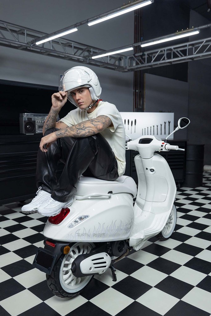 Ο Καναδός ποπ σταρ Justin Bieber, είναι ο τελευταίος που σχεδίασε μια αποκλειστική έκδοση. Σε αυτήν την περίπτωση, το θέμα είναι η Vespa Sprint που χαρακτηρίζεται από έναν αυστηρό, μονοχρωματικό συνδυασμό λευκών αποχρώσεων. Ακόμα και τα γκριπ στο τιμόνι είναι λευκά, μόνο ο κινητήρας και το σύστημα εξάτμισης που βγαίνει κάτω από τη δεξιά πλευρά παραμένουν στο βασικό τους μαύρο. Ο Bieber, που κατάγεται από το Οντάριο, λατρεύει τη Vespa και περιγράφει την πρώτη του βόλτα με το σκούτερ ως μια πολύ ωραία εμπειρία που πυροδότησε την καλλιτεχνική του δημιουργικότητα. Aνυπομονούμε λοιπόν να δούμε αποδεικτικά στοιχεία για αυτό.